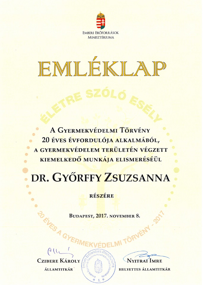 Emléklappal és plakettel ismerte el dr. Győrffy Zsuzsanna jogi főreferens gyermekvédelem érdekében végzett munkáját az emberi erőforrások minisztériuma. A gyermekvédelmi törvény megalkotásának huszadik évfordulóján, a Szociális Munka Napja alkalmából átadott dokumentum az Életre szóló esély mottót viseli, kifejezve annak fontosságát, amit a gyermekvédelemben, a gyermeki jogok megőrzésén és tiszteletén dolgozó szakemberek a maguk szakterületén végeznek.