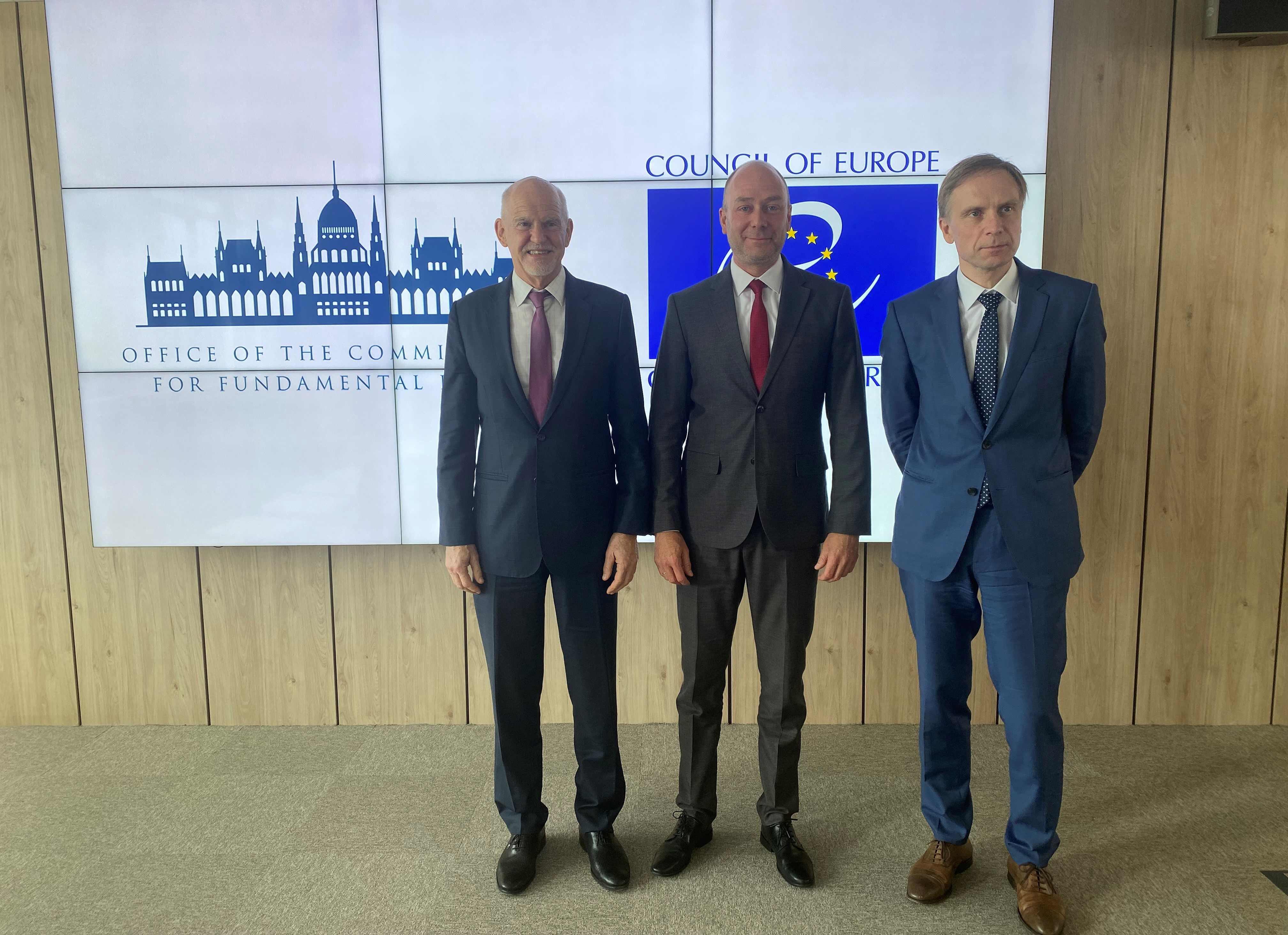 Dr. Kozma Ákos, az alapvető jogok biztosa hivatalában fogadta Jórgosz Papandréu görög és Eerik-Niiles Kross észt képviselőt, az Európa Tanács Parlamenti Közgyűlése Monitoring Bizottságának tagjait 2022. június 14-én.